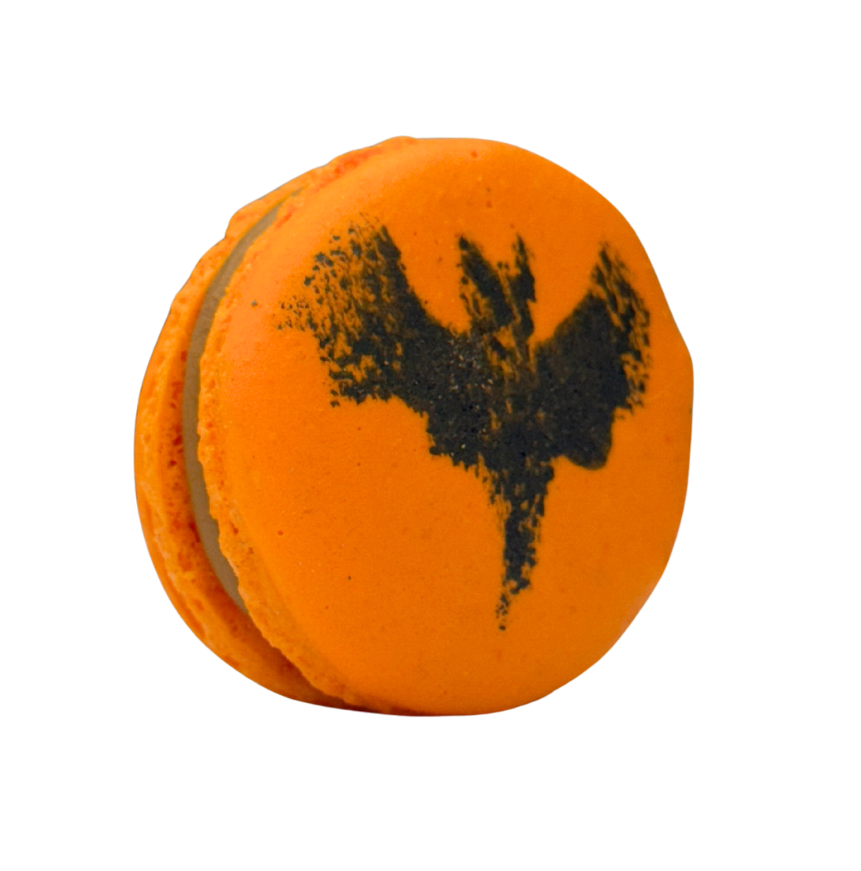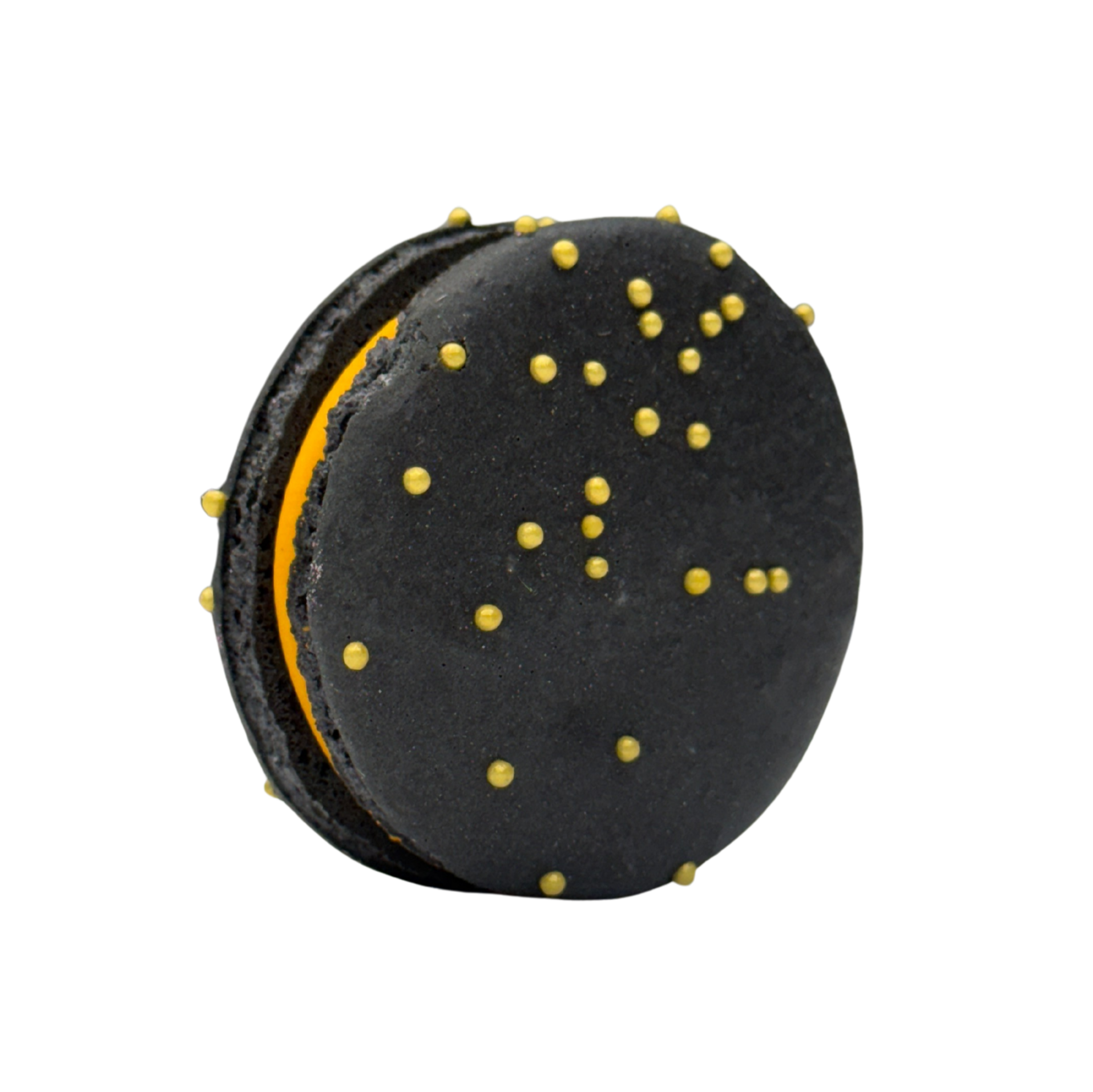 A dairy-free macaron with a coconut dark chocolate ganache, filled with roasted coconut.